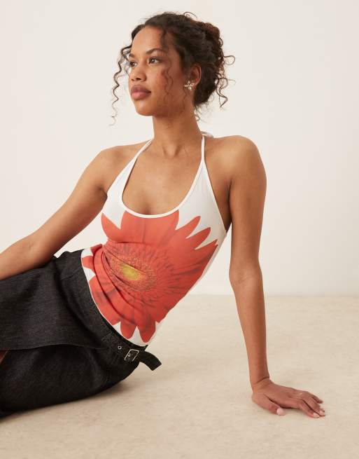 Tyler Mcgillivary gerbera flower bloom print halter top in white