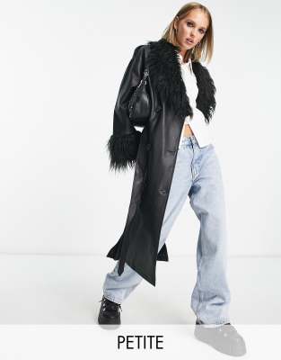 Urban Code Petite longline PU trench coat with faux shaggy fur collar in black