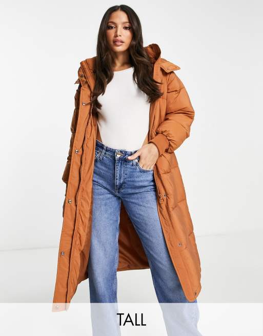 Urbancode Tall longline hooded puffer jacket in toffee brown