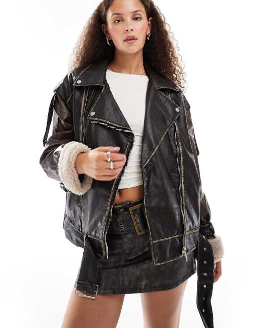 Urban Revivo faux leather oversized biker jacket in brown