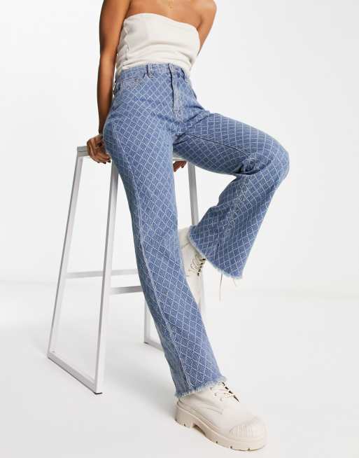 Urban Revivo laser print raw edge straight leg jeans in blue