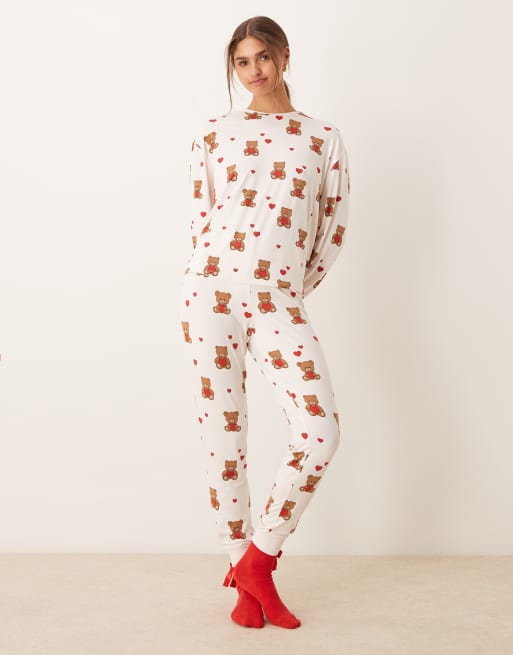 Urban Threads long sleeve sweat and jogger pyjama set in love teddy bear print