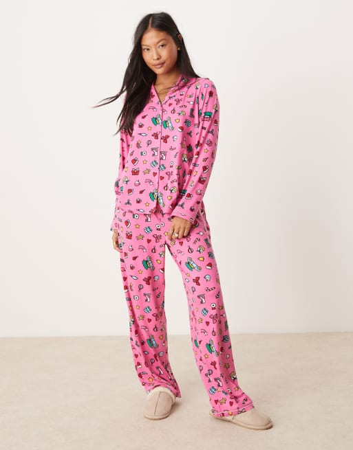 Urban Threads Petite Christmas poly long sleeve revere top and trouser pyjama set in festive print