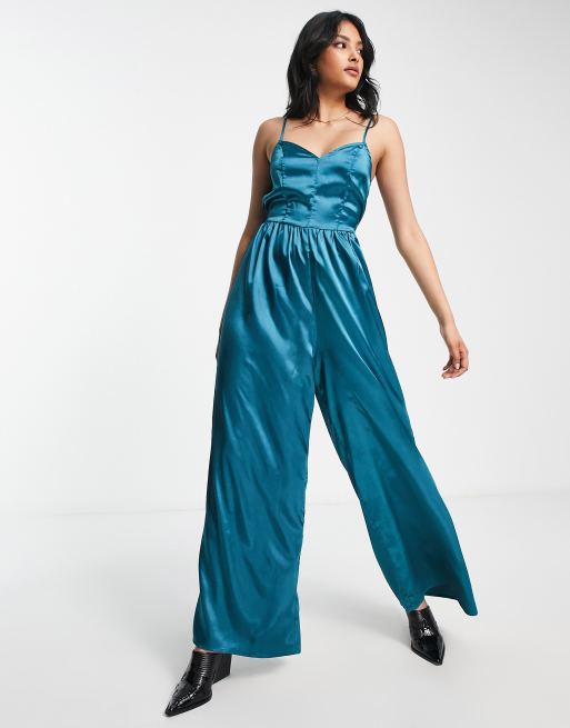 Urban Threads wide leg cami strap satin jumpsuit in teal