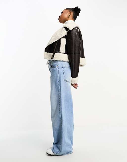 Urbancode cropped aviator jacket with borg trims in chocolate brown