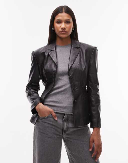 Urbancode fitted leather blazer jacket in black