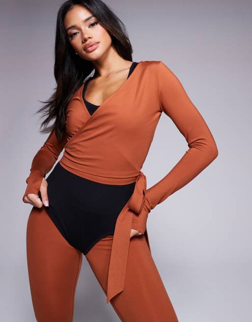 4505 soft touch ballet inspired wrap long sleeve top in gingerbread