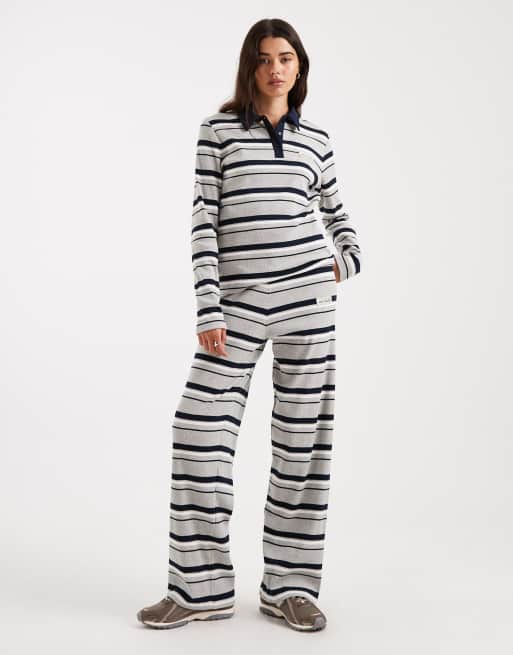 4th & Reckless cotton blend logo detail ribbed elastic waist wide leg pants in navy and gray stripes - part of a set
