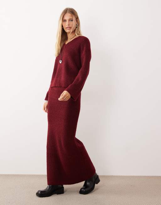 4th & Reckless fluffy textured v-neck sweater and maxi skirt set in burgundy