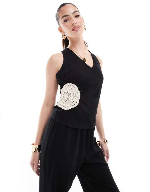 4th & Reckless linen look crochet flower detail halterneck beach top in black - part of a set