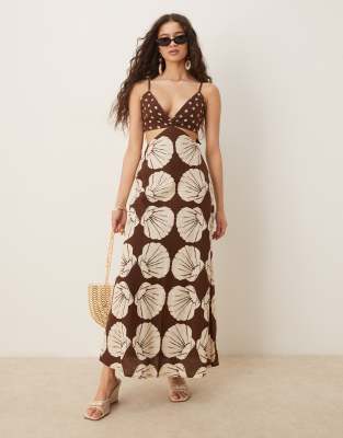 Abercrombie & Fitch spaghetti straps cutout slip linen blend maxi dress in brown print