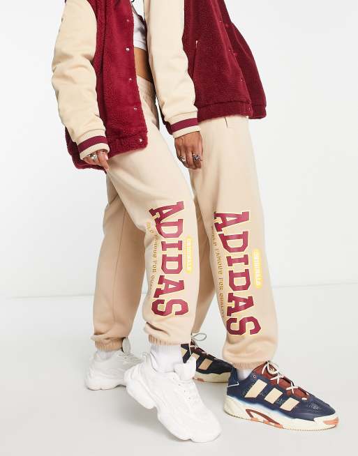 adidas Originals 'Preppy Varsity' large logo oversized sweatpants in beige