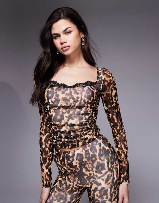 AFRM Marcello ruched mesh lace trim top in leopard print - part of a set