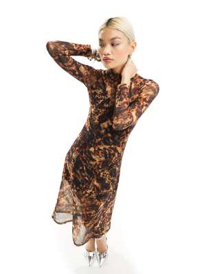 AllSaints Hanna Spark printed mesh midi dress in brown