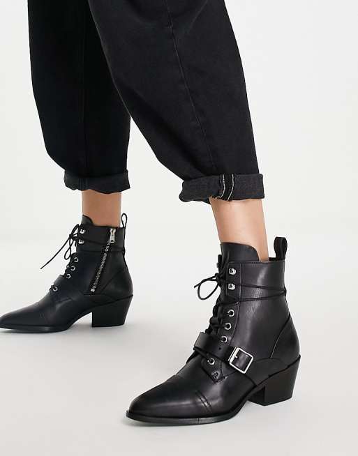 AllSaints Katy lace up heeled leather boots with buckle in black