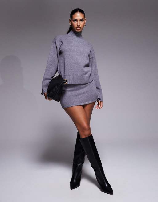 Aria Cove high neck oversized sleeve sweater and mini skirt set in gray