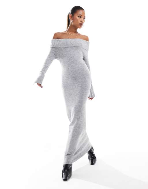 Aria Cove knitted bardot fold over maxi sweater dress in gray heather
