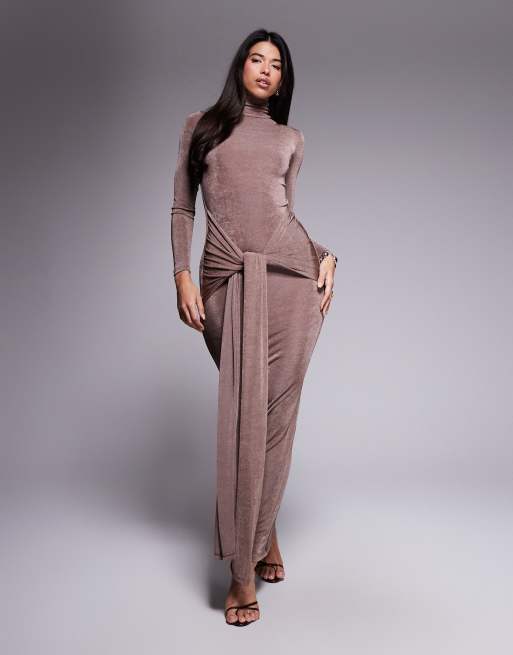 Aria Cove slinky high neck knot drape front maxi dress in mocha