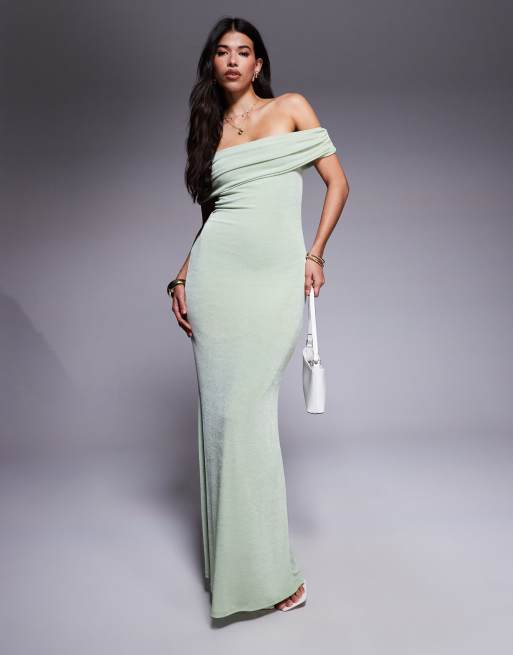 Aria Cove slinky ruched off the shoulder bodycon maxi dress in green