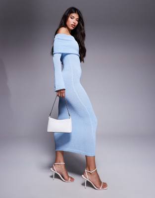 Aria Cove textured boucle ruched bardot fold-over maxi dress in blue