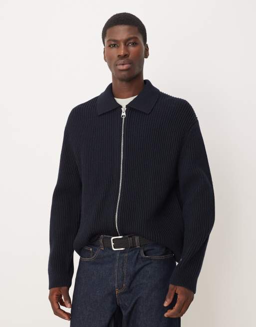 ARKET wool blend chunky rib knit cardigan with two-way zip in navy blue