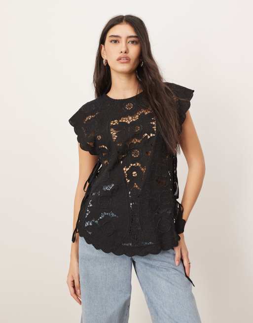 ARRANGE cotton cutwork embroidered top with tie side in black
