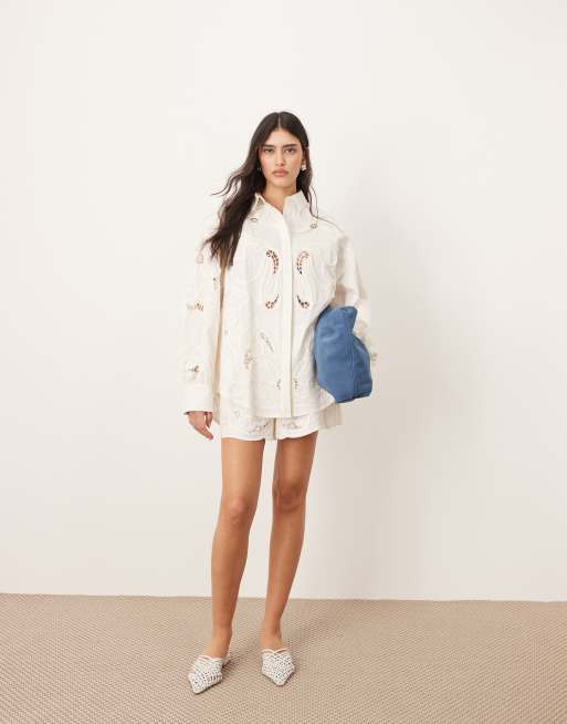 ARRANGE cotton mirrored floral embroidered cutwork shirt and shorts set in white