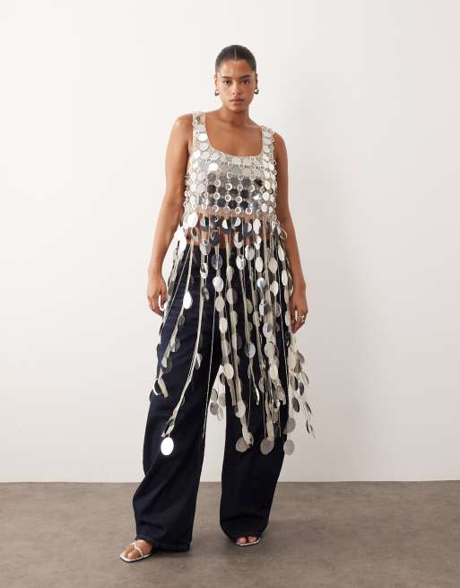 ARRANGE Curve futurist sequin crop top with long 3D fringe hem in silver