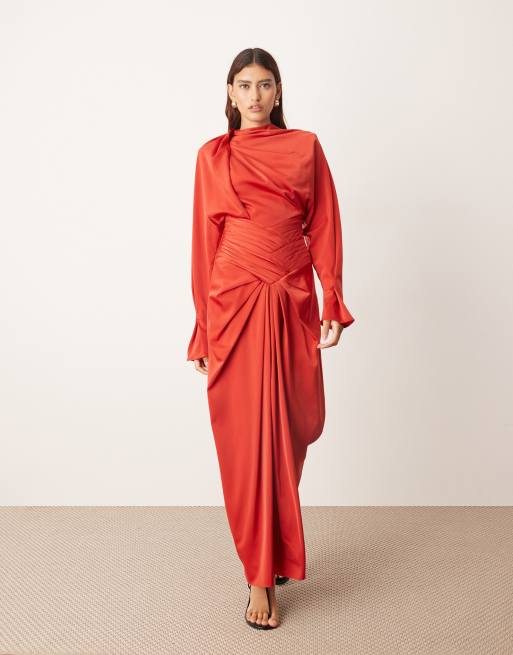 ARRANGE drape neck strong shoulders maxi dress with open back in red