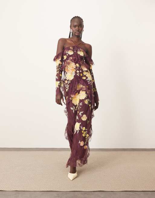 ARRANGE embroidered lace halter cold shoulder ruffle maxi dress in burgundy