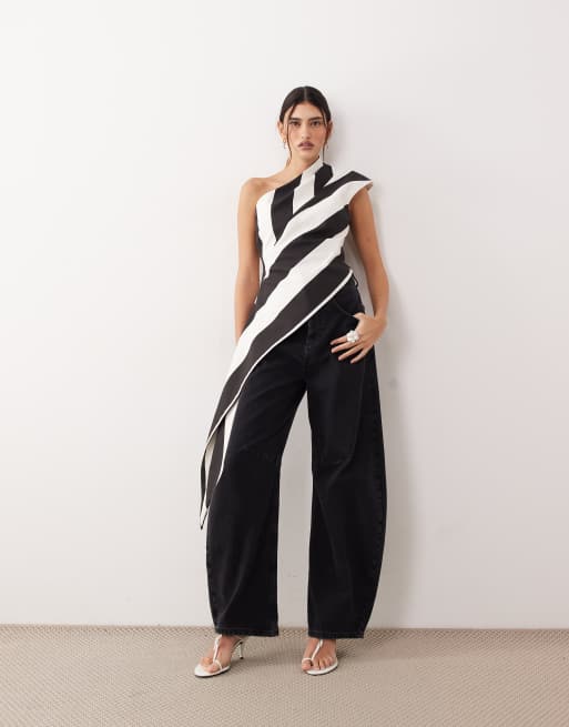 ARRANGE one shoulder draped top in black and white stripes