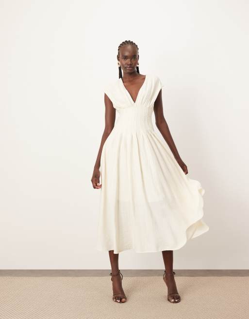 ARRANGE premium structured linen pleated waist midi dress with tie back detail in natural