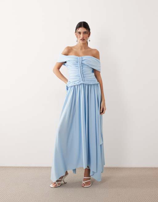 ARRANGE ruched off the shoulder maxi dress in duck-egg blue