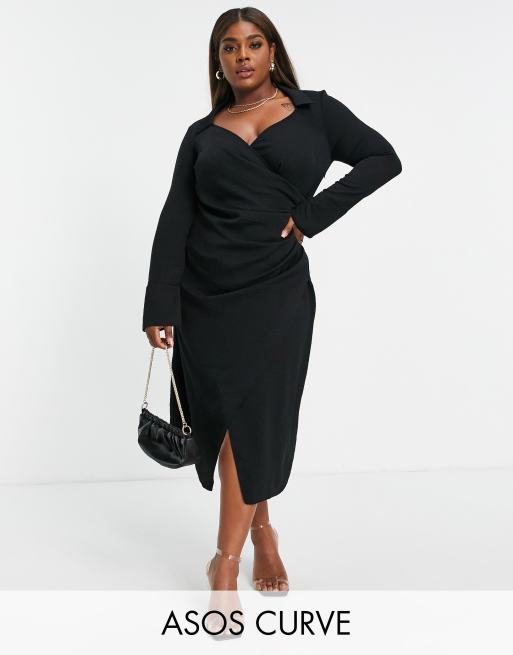 ASOS DESIGN Curve 70s drape front wrap midi dress in black