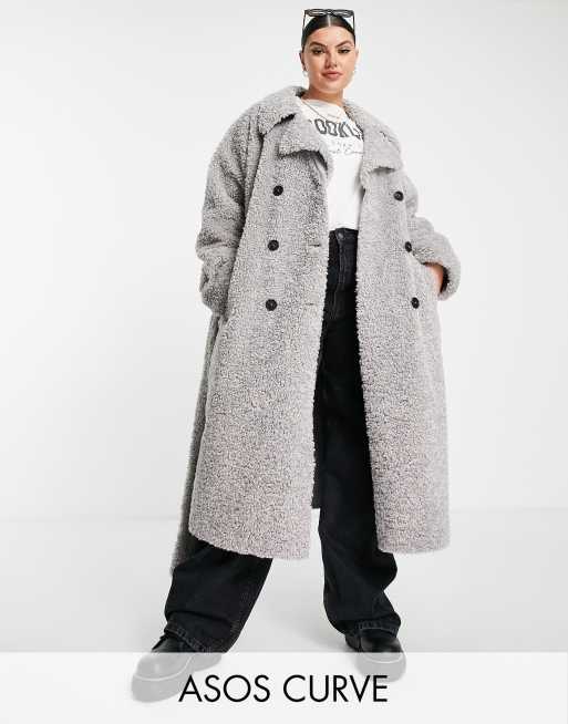 ASOS DESIGN Curve bonded shearling trench coat in gray