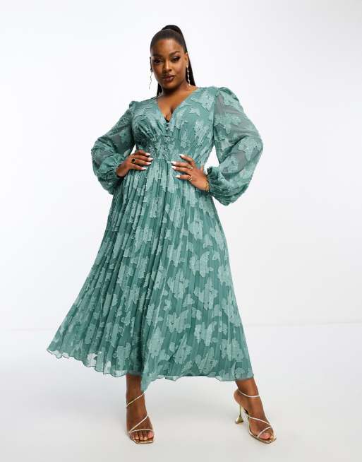 ASOS DESIGN Curve burnout button through shirred waist pleated midi dress in teal
