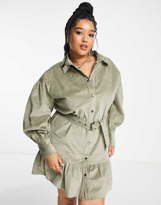 ASOS DESIGN Curve cord mini shirt dress with buckle in khaki