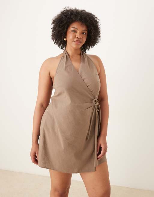 ASOS DESIGN Curve cotton linen blend halter neck wrap mini sundress in ash brown