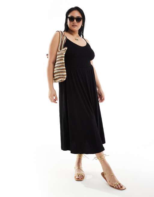 ASOS DESIGN Curve crinkle cami shirred bodice full skirt midi dress in black