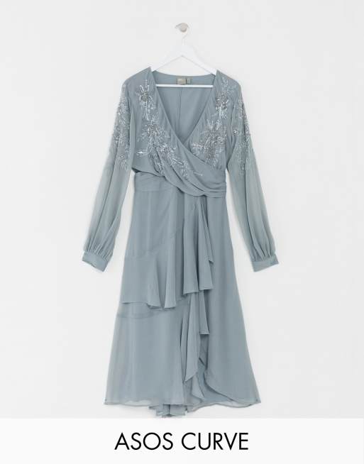 ASOS DESIGN Curve embellished wrap waist midi dress with double layer skirt and long sleeves