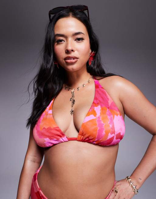 ASOS DESIGN Curve Exclusive Arina high apex bikini top in pink & red abstract print