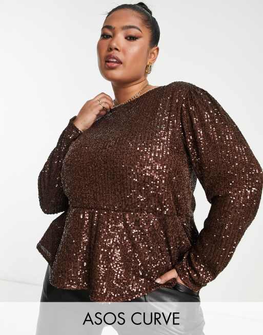 ASOS DESIGN Curve exclusive sequin long sleeve smock top in chocolate