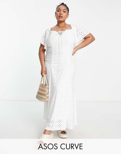 ASOS DESIGN Curve eyelet flutter sleeve ruched front midi dress in white