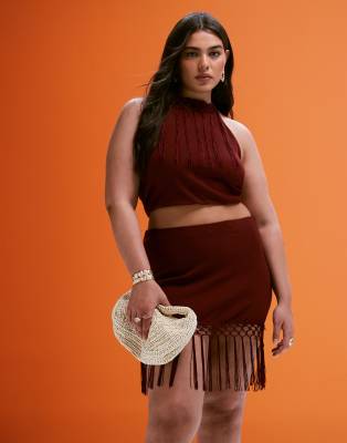ASOS DESIGN Curve fringed halterneck top in rust - part of a set