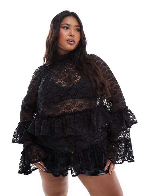 ASOS DESIGN Curve high neck lace tiered top in black