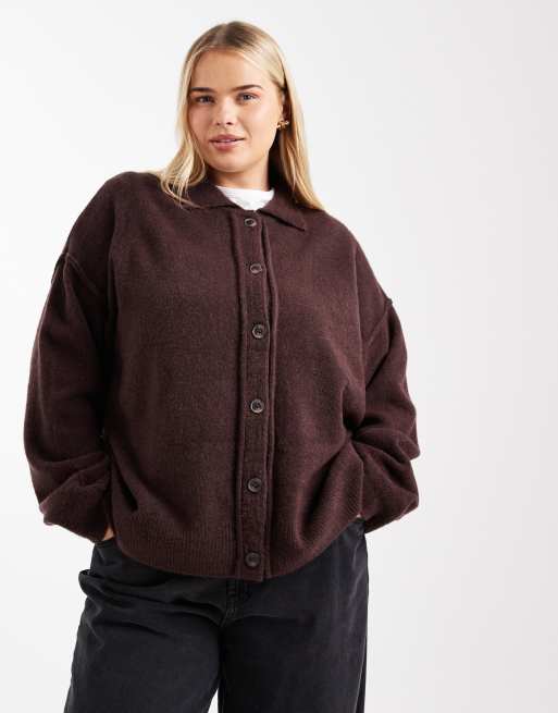 ASOS DESIGN Curve knit collar shirt cardigan with seam detail in plum