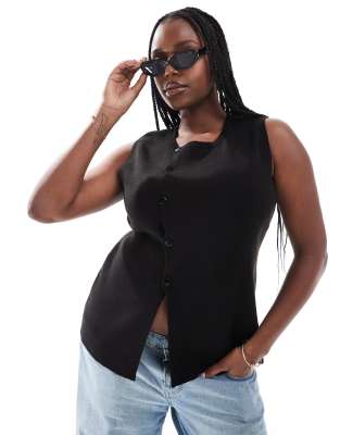 ASOS DESIGN Curve knit structured asymmetric button front vest with slit in black