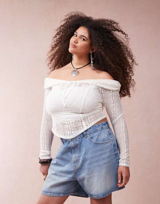 ASOS DESIGN Curve lace off-the-shoulder long sleeve top with tie detail