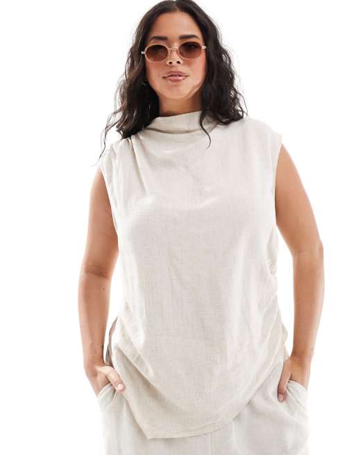 ASOS DESIGN Curve linen mix drape high neck asymmetric smart top in natural