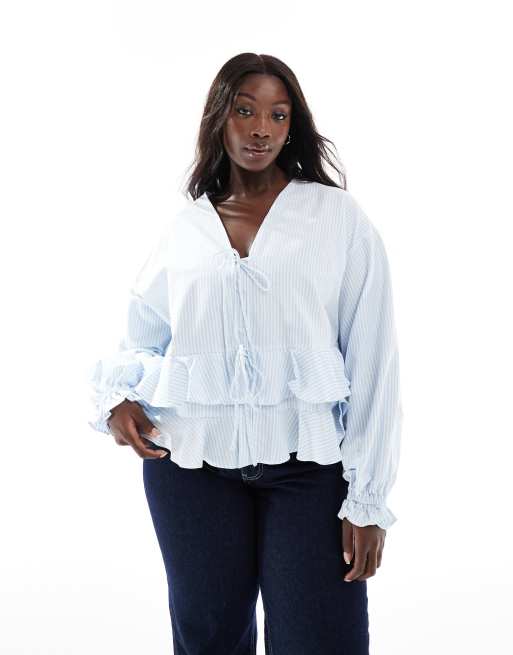ASOS DESIGN Curve long sleeve tie front ruffle hem top in blue stripe
